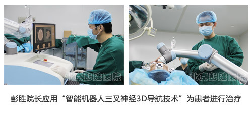 北京彭胜医院将目前新一代机器人技术应用于三叉神经痛的治疗,在国内尚属首家。“智能机器人三叉神经3D导航技术”成熟地把主要包括图像数据输入、图像数据处理与测量、三维重建显示、治疗计划设计、评估、输出、病历数据库管理等功能模块,科学地纳入进治疗流程,为医生提供了无与伦比的帮助,实现了无框架及远程操作立体导航技术,这项技术在三叉神经痛治疗的学科前沿领域迈出了具有重要意义的一步,标志着我国治疗三叉神经痛的学科水平已经进入了“机器人时代”。