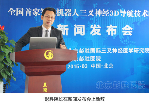 2015年3月21日,“全国首家智能机器人三叉神经3D导航技术临床应用新闻发布会”在京召开,北京彭胜医院与国内多家科研机构联合研发的,能够辅助医生治疗三叉神经痛的智能机器人首次与社会公众见面;北京彭胜医院将“智能机器人三叉神经3D导航技术”成功应用于三叉神经痛临床治疗取得巨大成功,在国内属于首创,成为国内首家将智能机器人应用于临床治疗三叉神经痛的医疗机构,技术上达到了国际先进水平。
